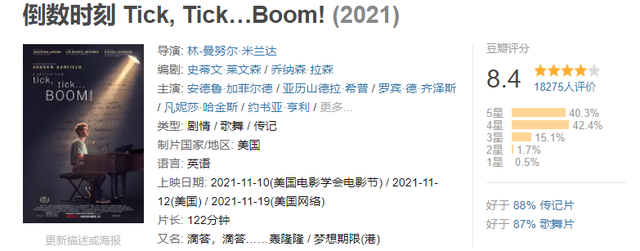 《爱乐之城》拿到了8.4的高评分,五年之后,又出现了一部同样高品质的音乐剧电影《倒数时刻》。这部影片没有那么庞大的叙事结构,甚至看不到导演的野心,他仅仅只是为了写人,平静的叙事,但是却足以触动人心。